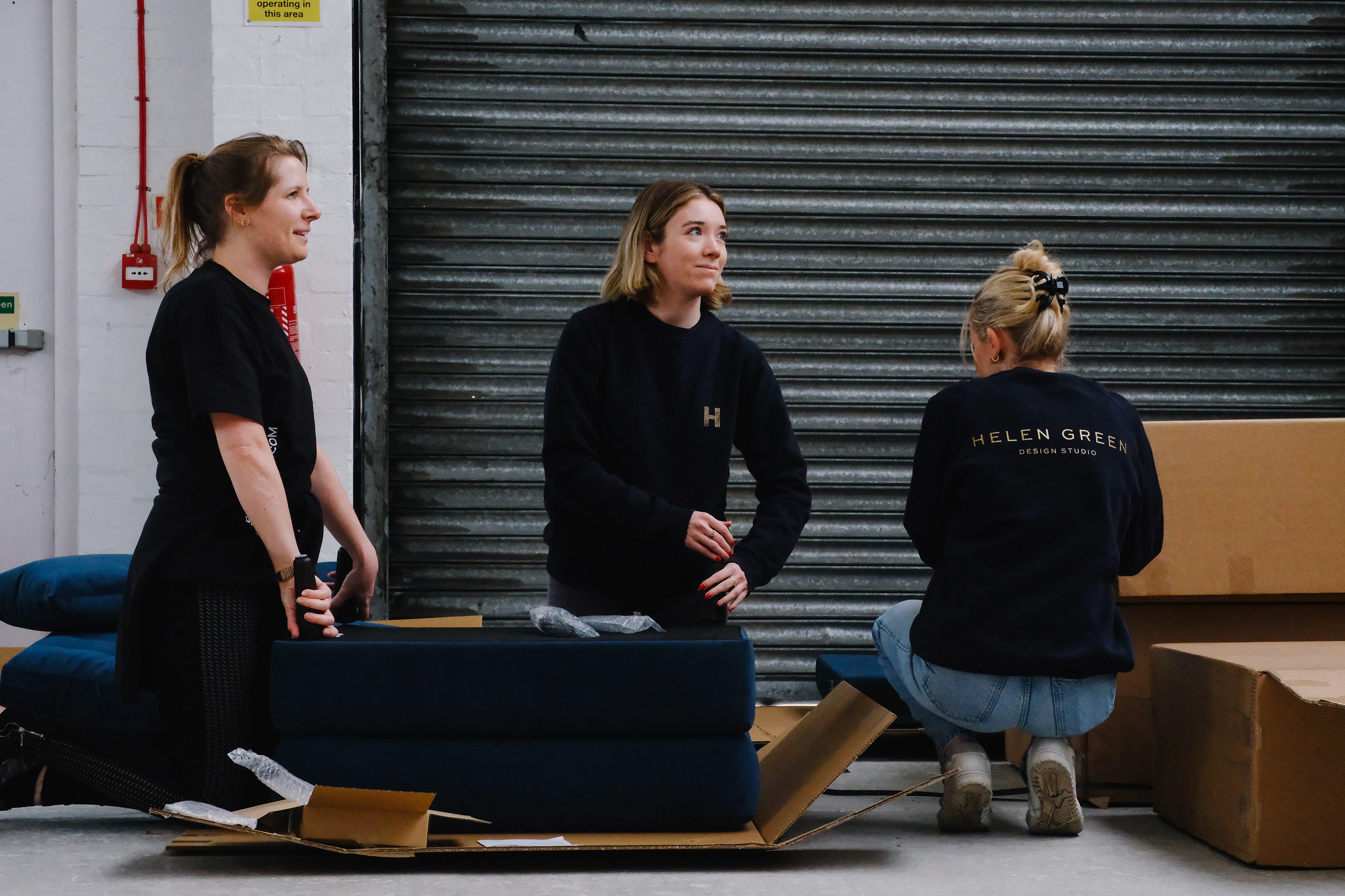 Our team from Rigby & Rigby, Lawson Robb, and Helen Green Design spent the day at Furnishing Futures’ East London headquarters, helping unpack and sort boxes of new furniture, accessories, artwork, and window treatment equipment. It was an inspiring and hands-on experience that gave us a real insight into the charity’s day-to-day operations and the tangible impact it makes in creating beautiful, functional homes for survivors.