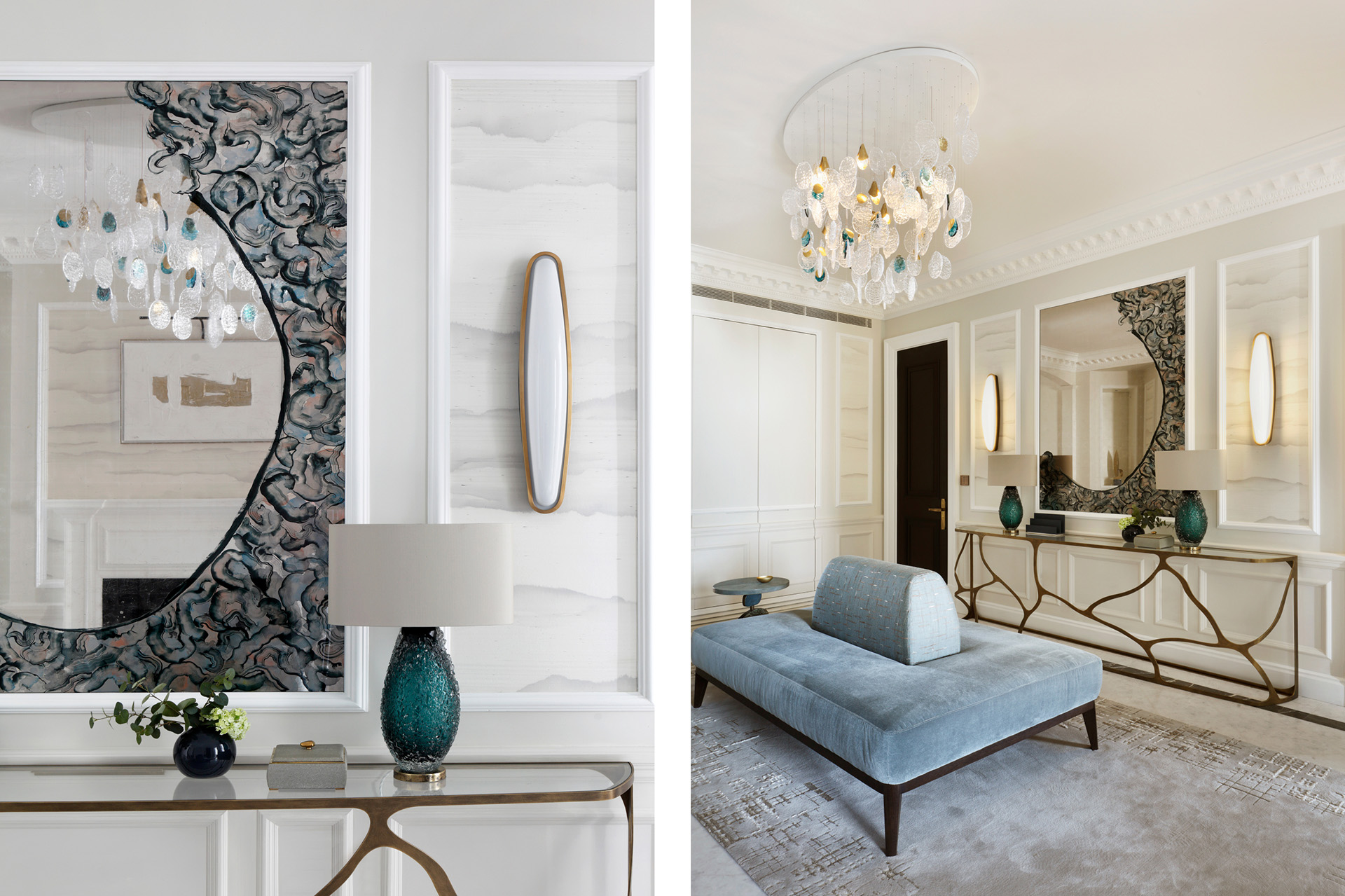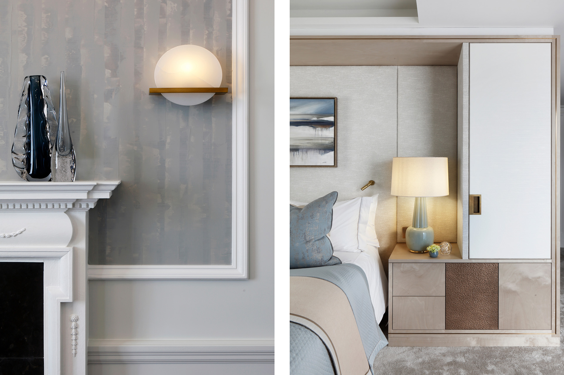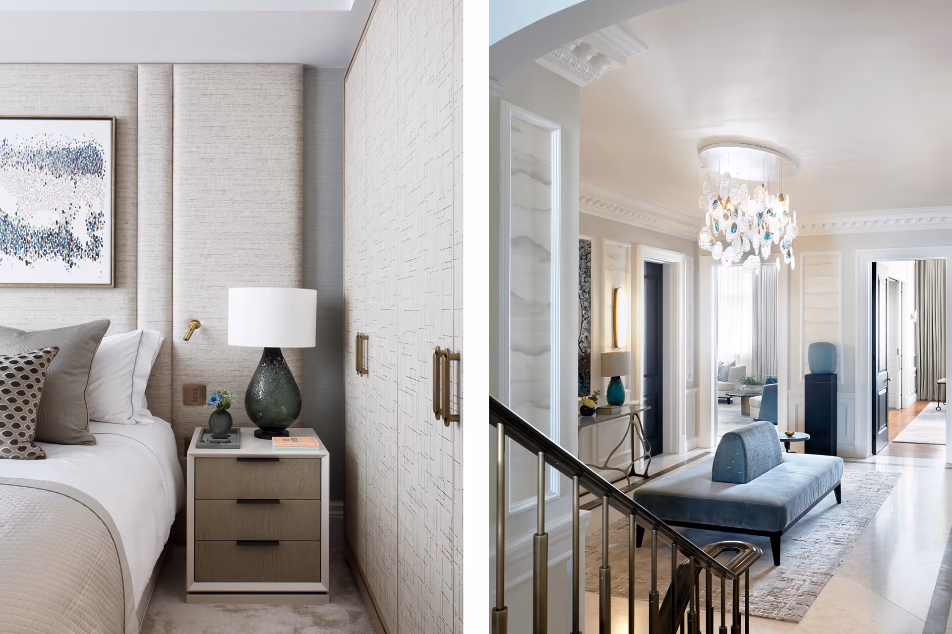 A carefully curated material palette brings a sense of calm and clarity to the apartment. Cool, refined tones are layered with texture and subtle pattern to create interiors that feel fresh and contemporary, yet inherently comfortable. Hand painted silk wallpapers add depth and interest to the principal reception spaces, while bespoke joinery and specialist finishes were developed in close collaboration with artisans, lending a quiet richness and individuality to the scheme.
