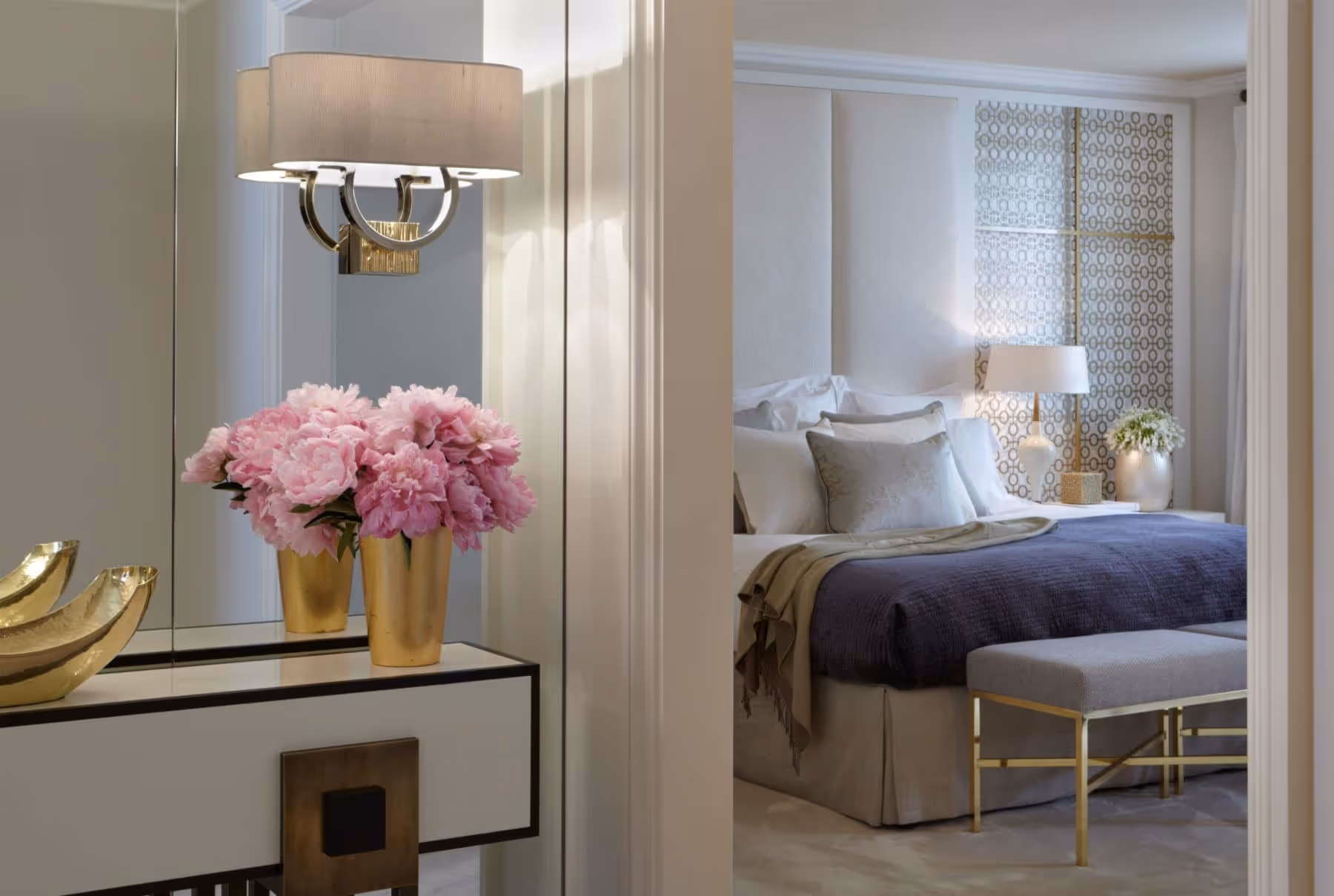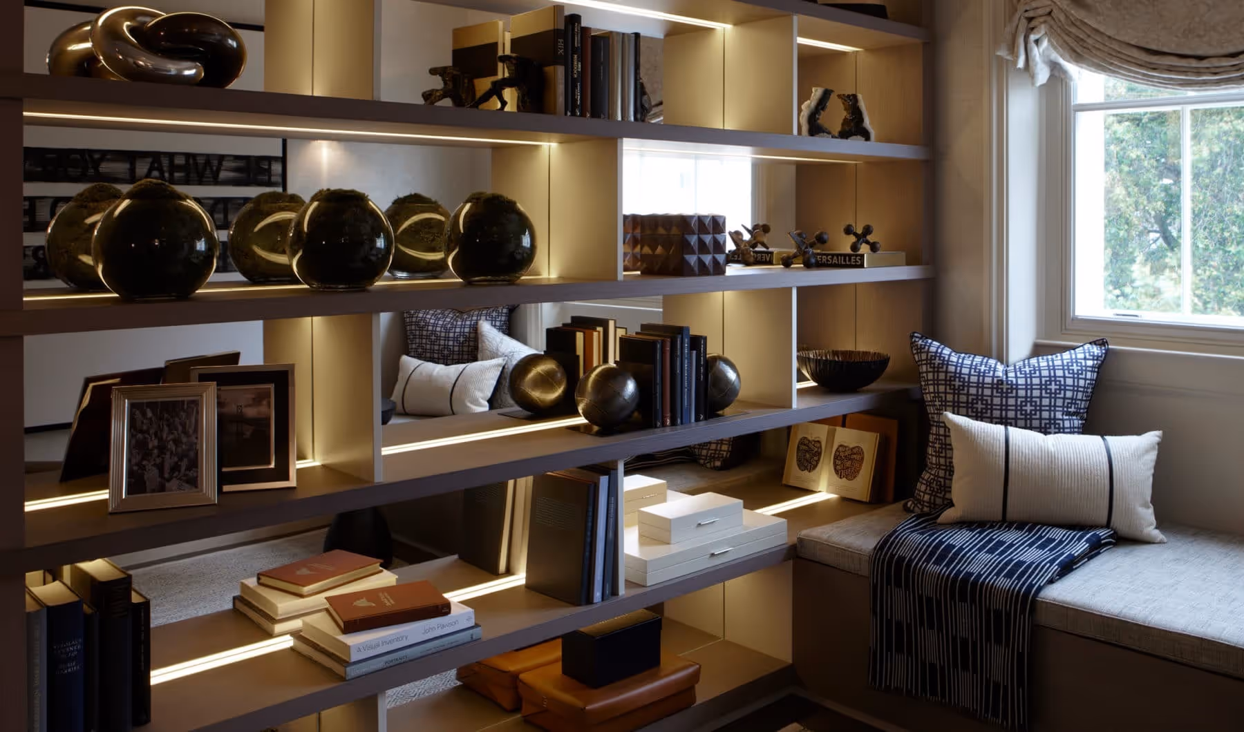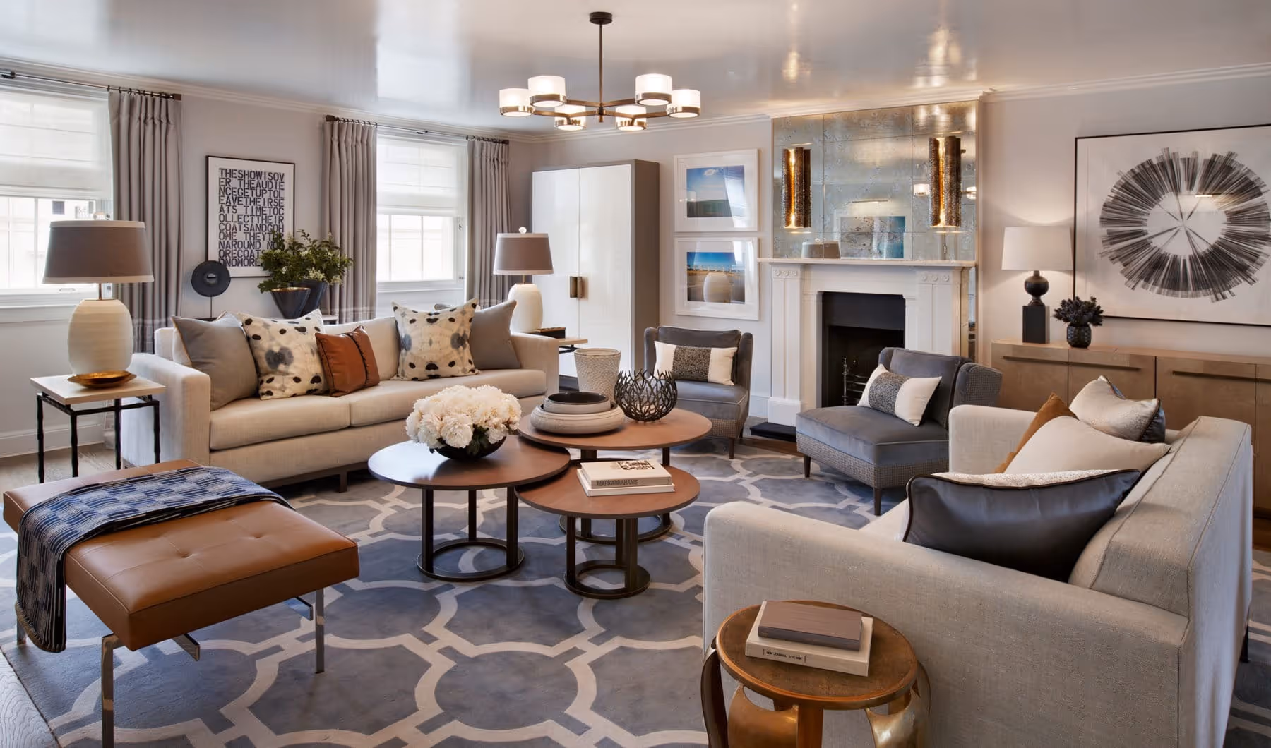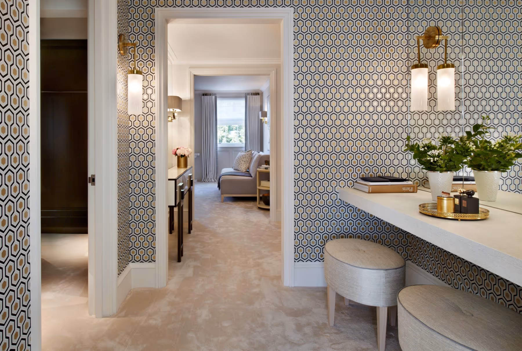 Dressed in rich fabrics and geometric patterns, this apartment is a considered balance between its heritage architecture and contemporary interiors. Statement wallpaper and bespoke rugs were added to bring a playful ambience to the project.