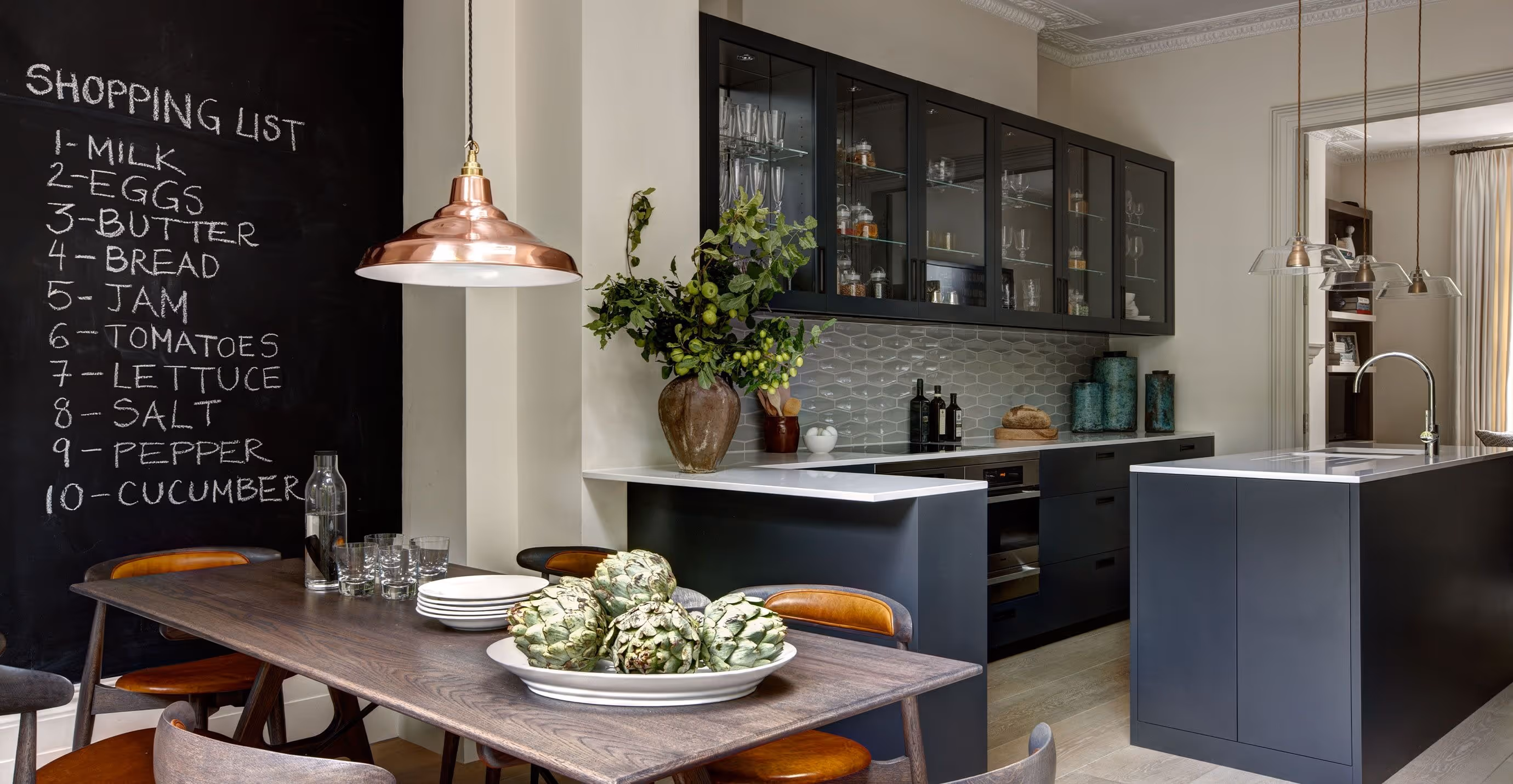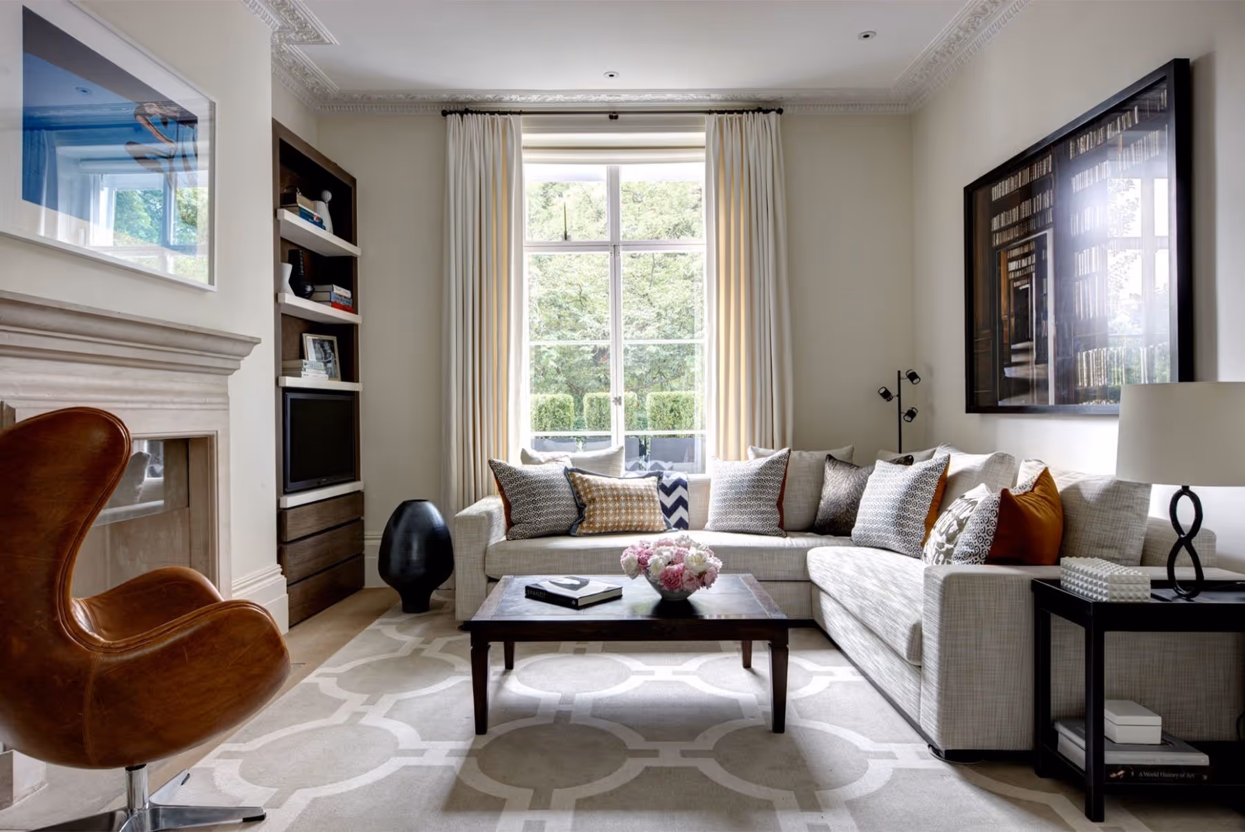 A neutral colour palette was selected for this family townhouse in the heart of Chelsea. Layered with sophisticated geometric patterns and detailed textures with the addition of burnt orange and light blue tones, the home is both elegant and liveable. At the centre of the home is an open plan kitchen and informal dining space focussed on family living.